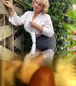 Sexy Lukerya drinks coffee on the washing machine and flirts hotly, switching clothes in front of fans.